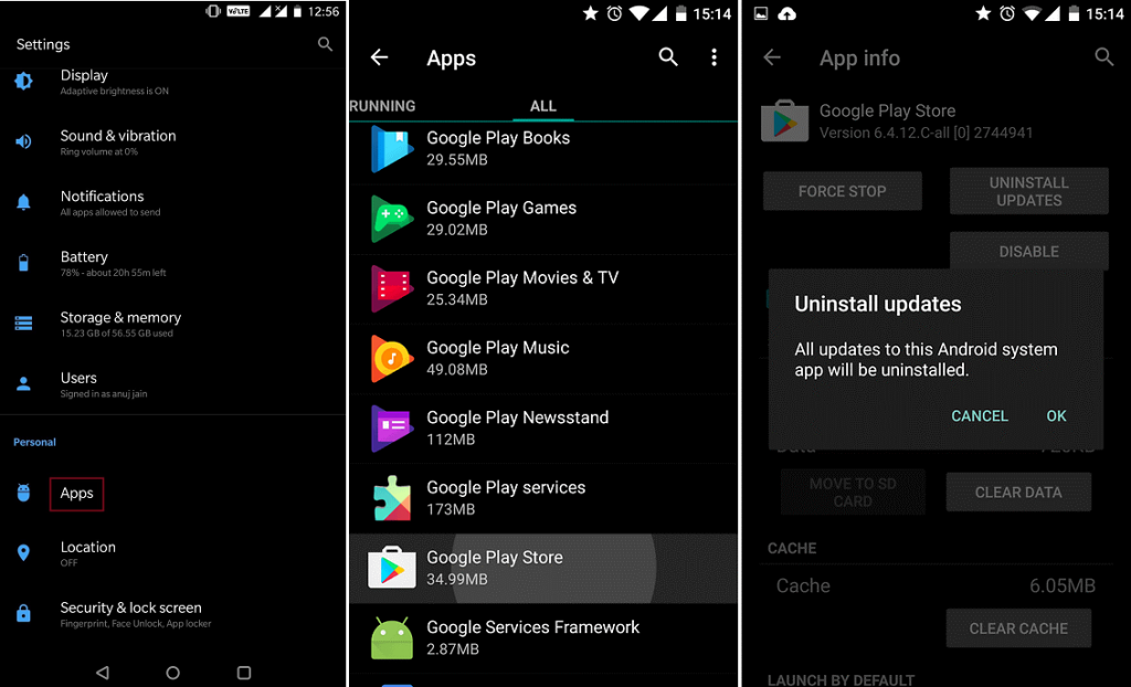 Fixieren 3: Deinstallieren Sie Updates aus dem Google Play Store