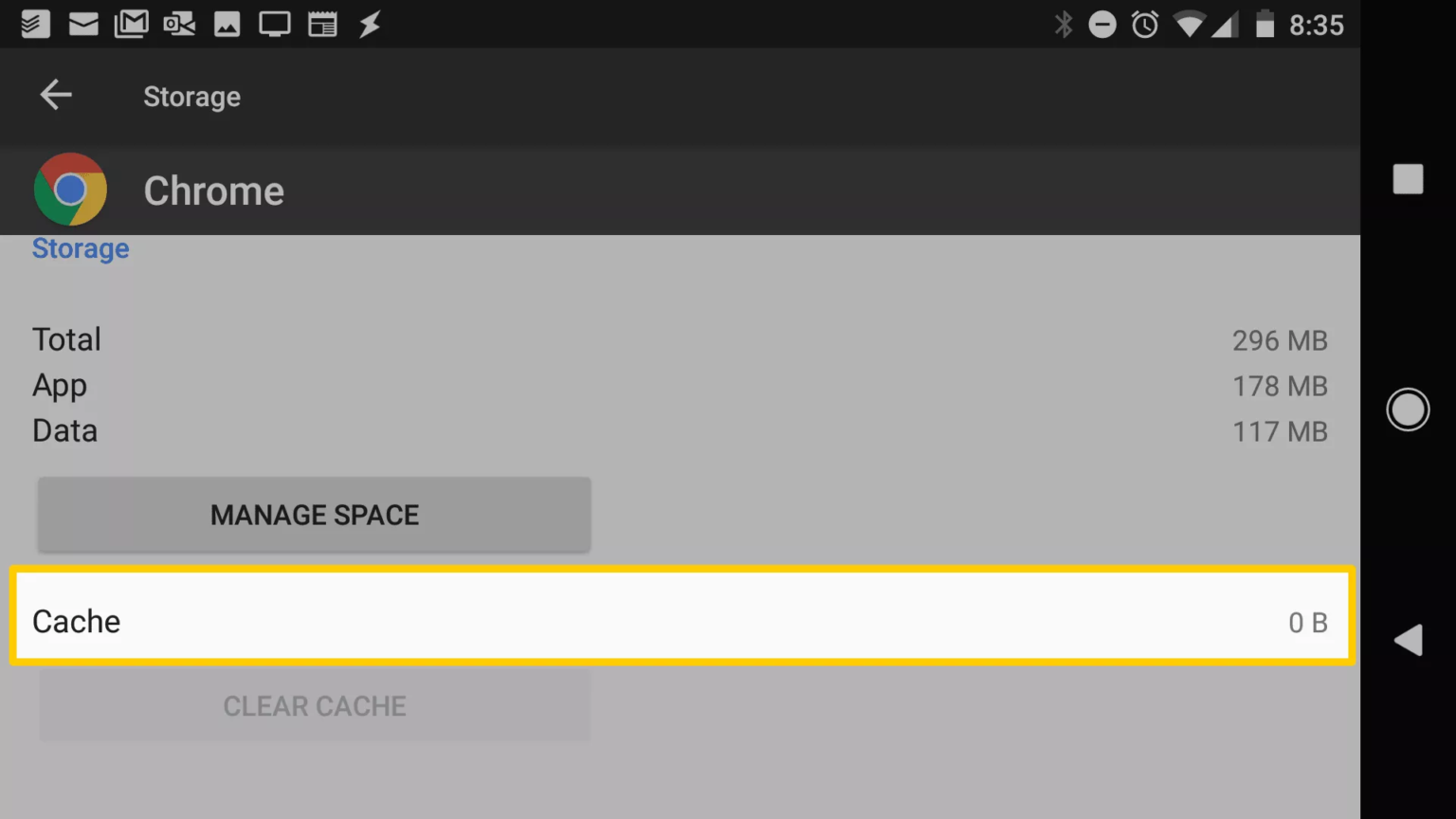 - Nachdem Sie den Cache geleert haben, sehen Sie eine Speicherauslastung von 0 MB