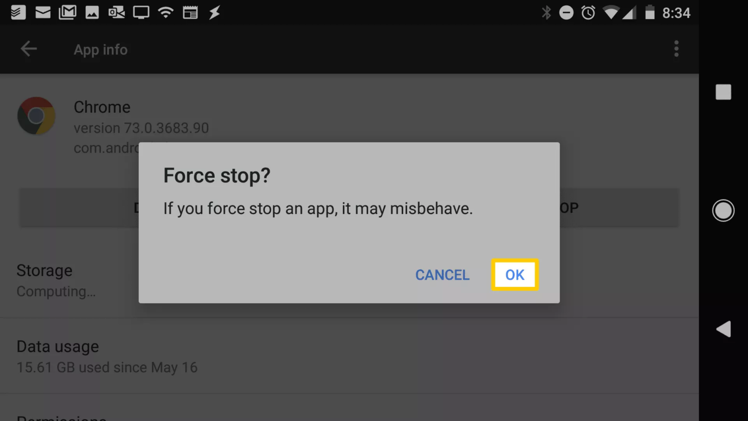 - Klicken Sie darauf und Sie erhalten eine Popup-Meldung mit der Aufforderung, die App zu stoppen. Klicken Sie einfach auf OK